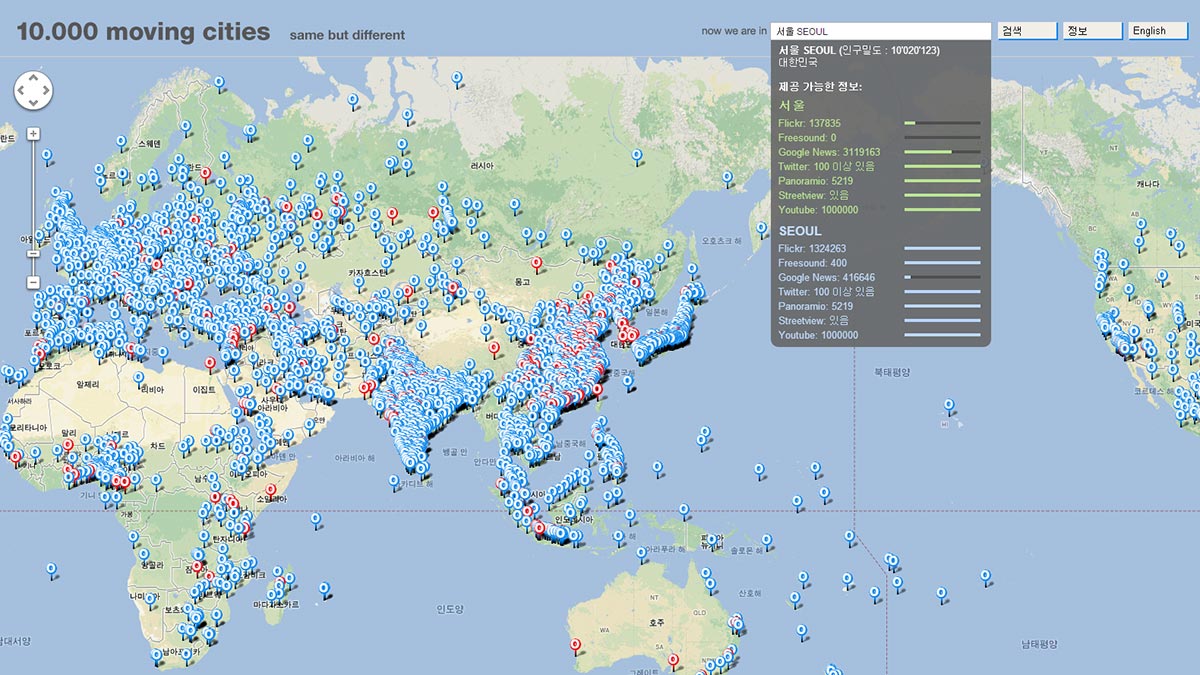 An interesting piece of interactive art that I found is called 10,000 Moving Cities Same but Different by Marc Lee. This is an augmented piece that shows real time(well about as real time as you can get without going to place cameras/get access to cameras and audio all around these places) cities projected onto basic cube and rectangular prism pieces set in a room. Audio based on the city being shown is also played.